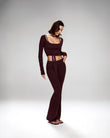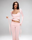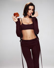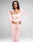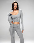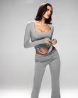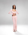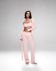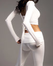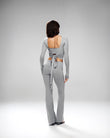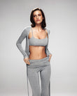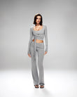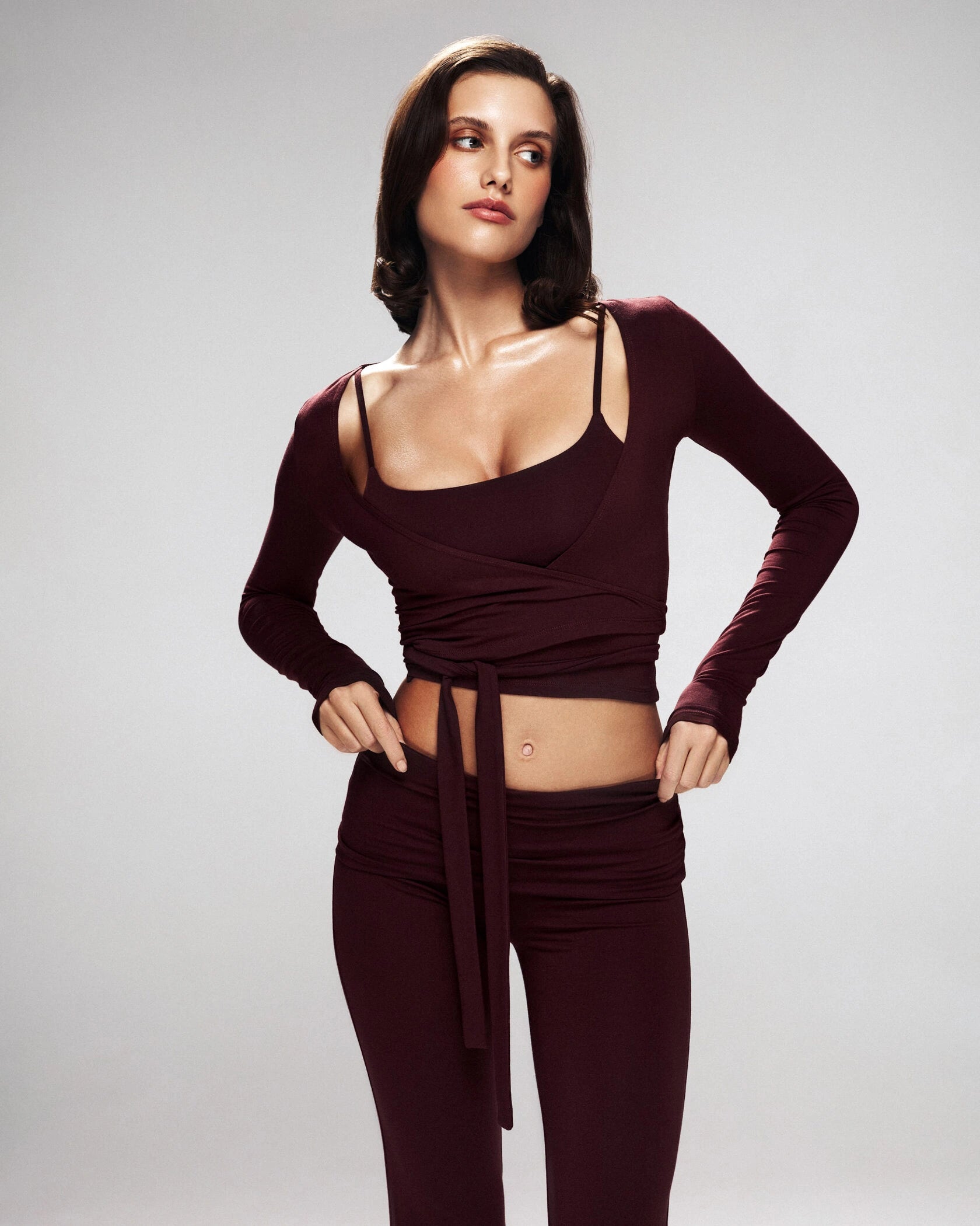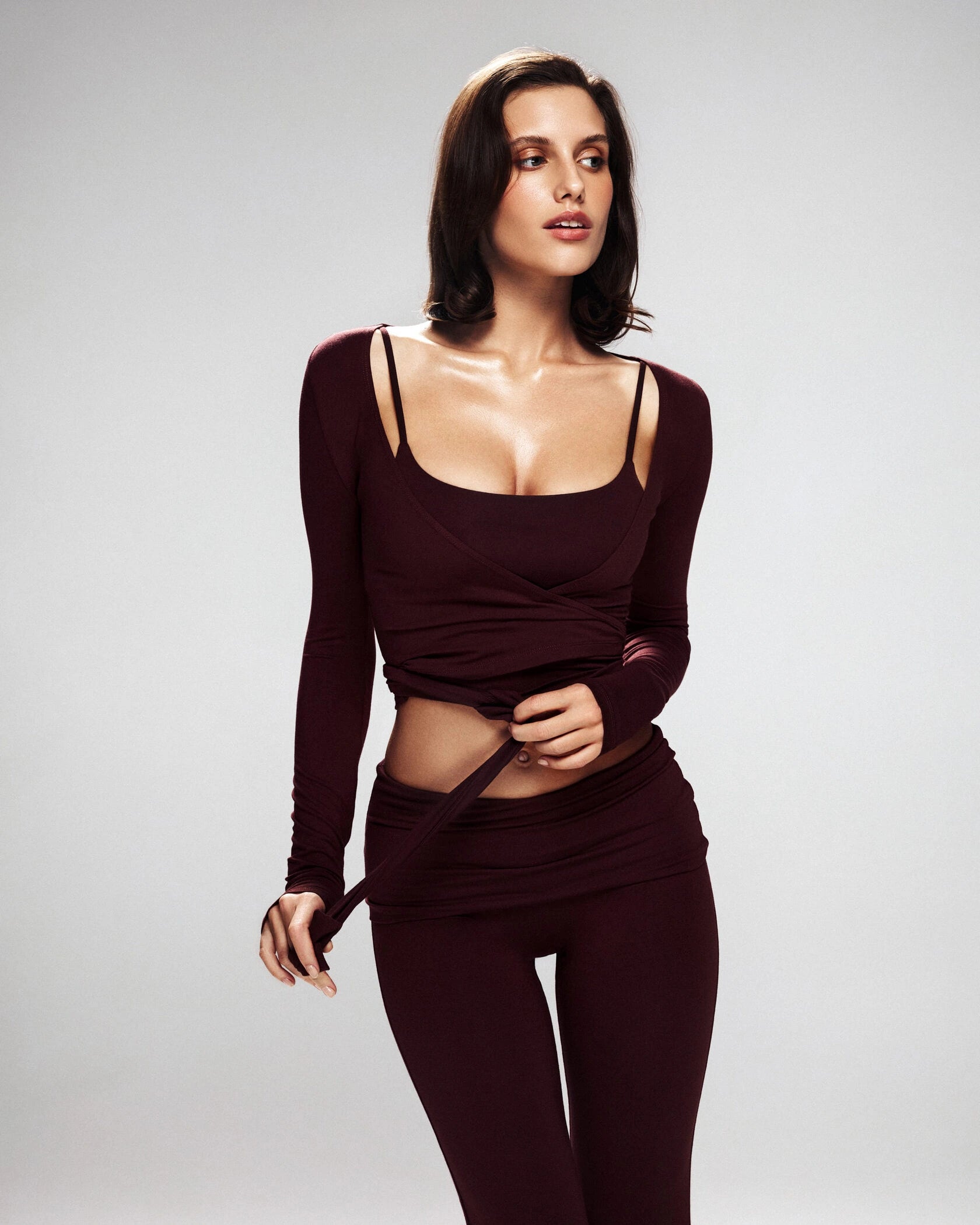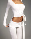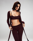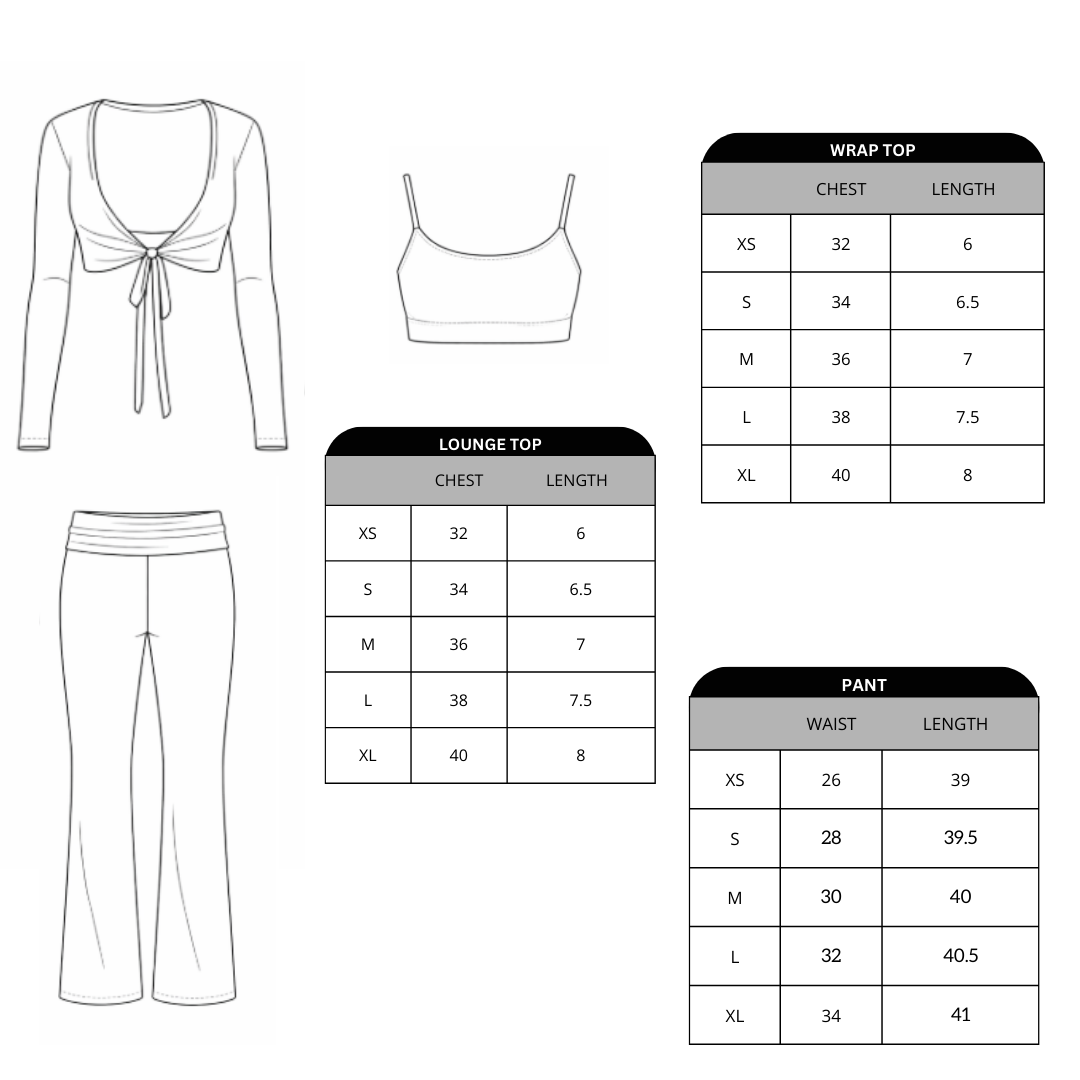 A refined three-piece set crafted from soft, breathable viscose lycra with comfortable stretch and shape retention. The fold-over yoga pants feature a slim fit and soft waistband for effortless movement, while the ballet top with narrow straps offers a flattering, non-restrictive fit. The convertible long-sleeve bolero can be tied at the front or back, adding versatile styling to the set. Designed for movement, lounging, and elevated everyday wear.