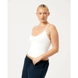 Woman wearing a white tank top against a plain background