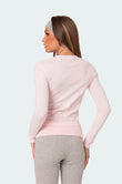 A female model wearing a pink rhinestone top with  long sleeves, paired with gray flare leggings. She is also holding a small white purse.