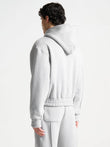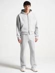 Person wearing a light gray hoodie and pants on a white background